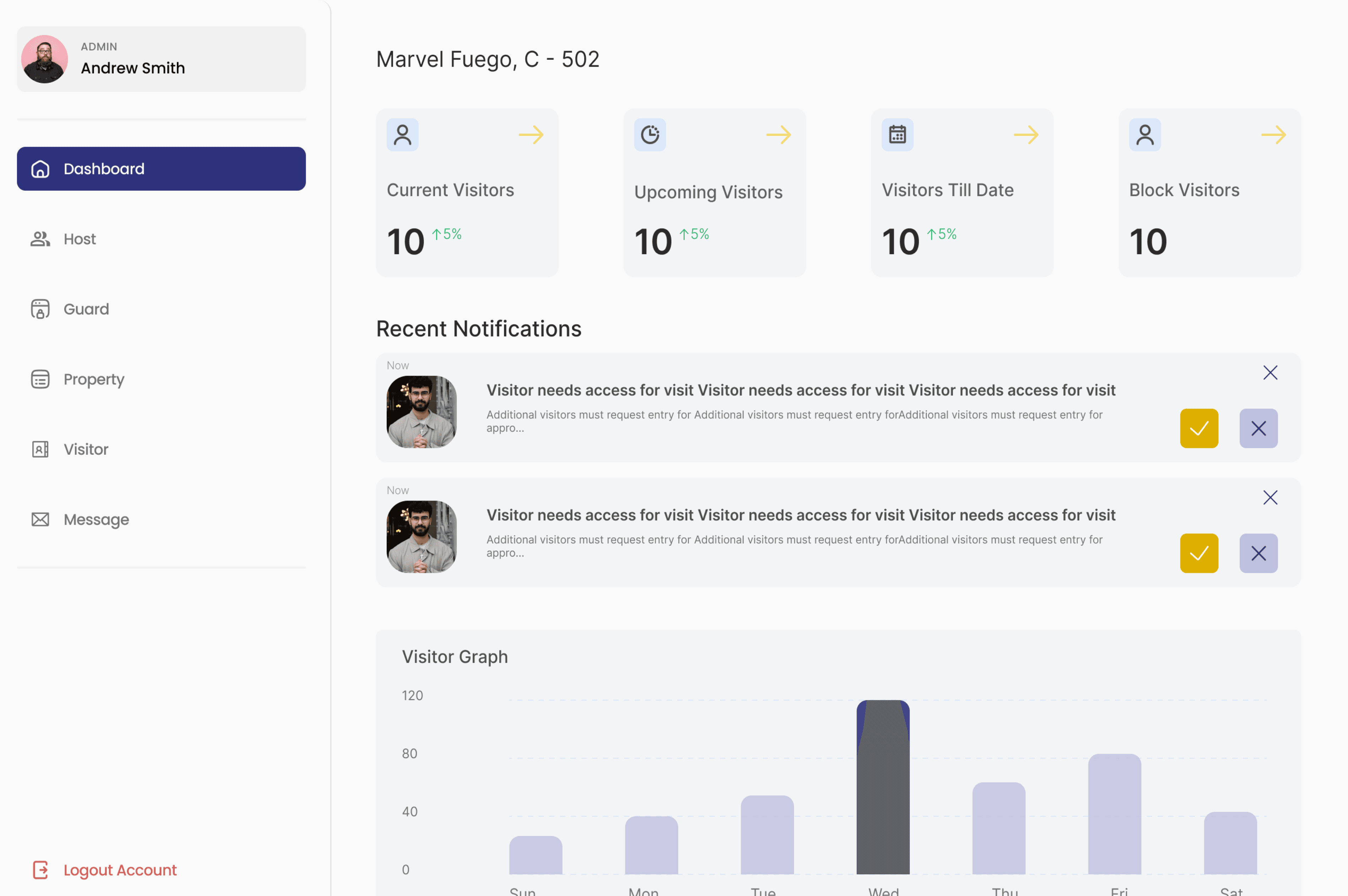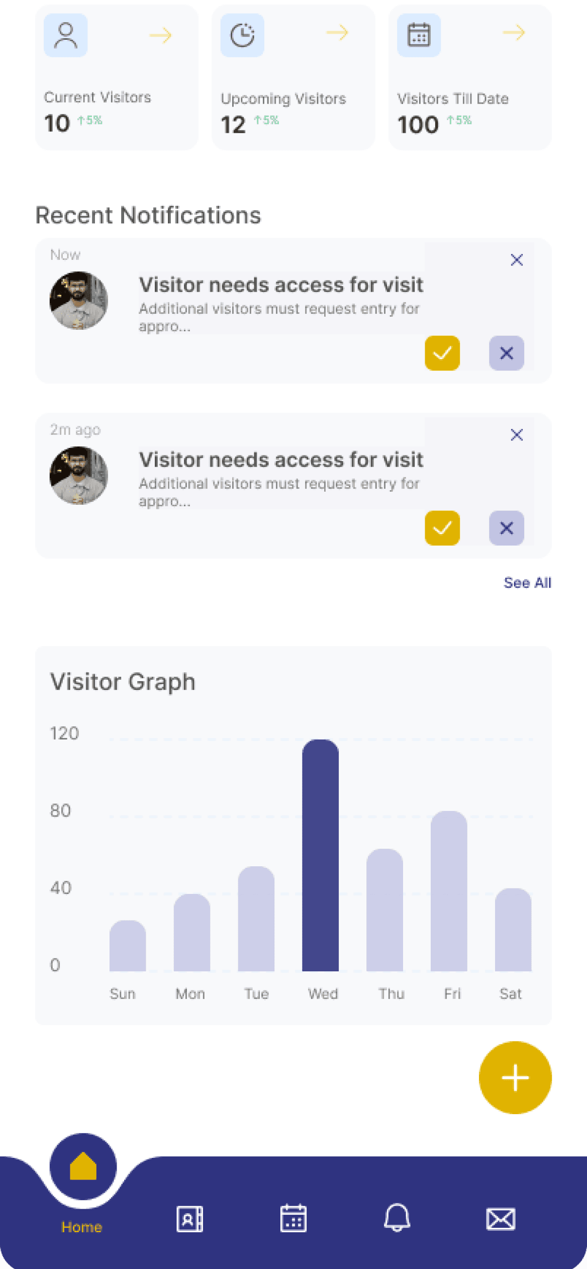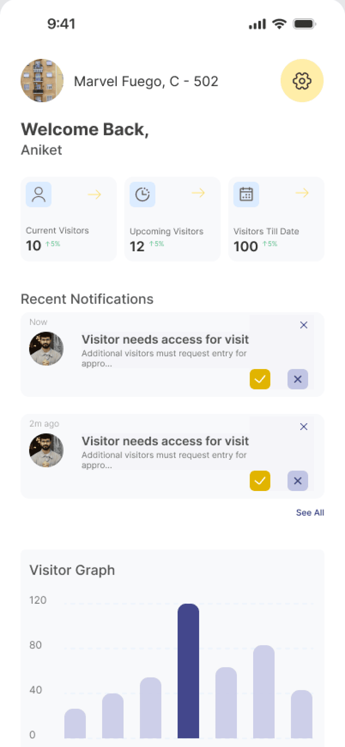 Notifications: A section displaying recent notifications like visitor arrivals, pending approvals, or important updates.