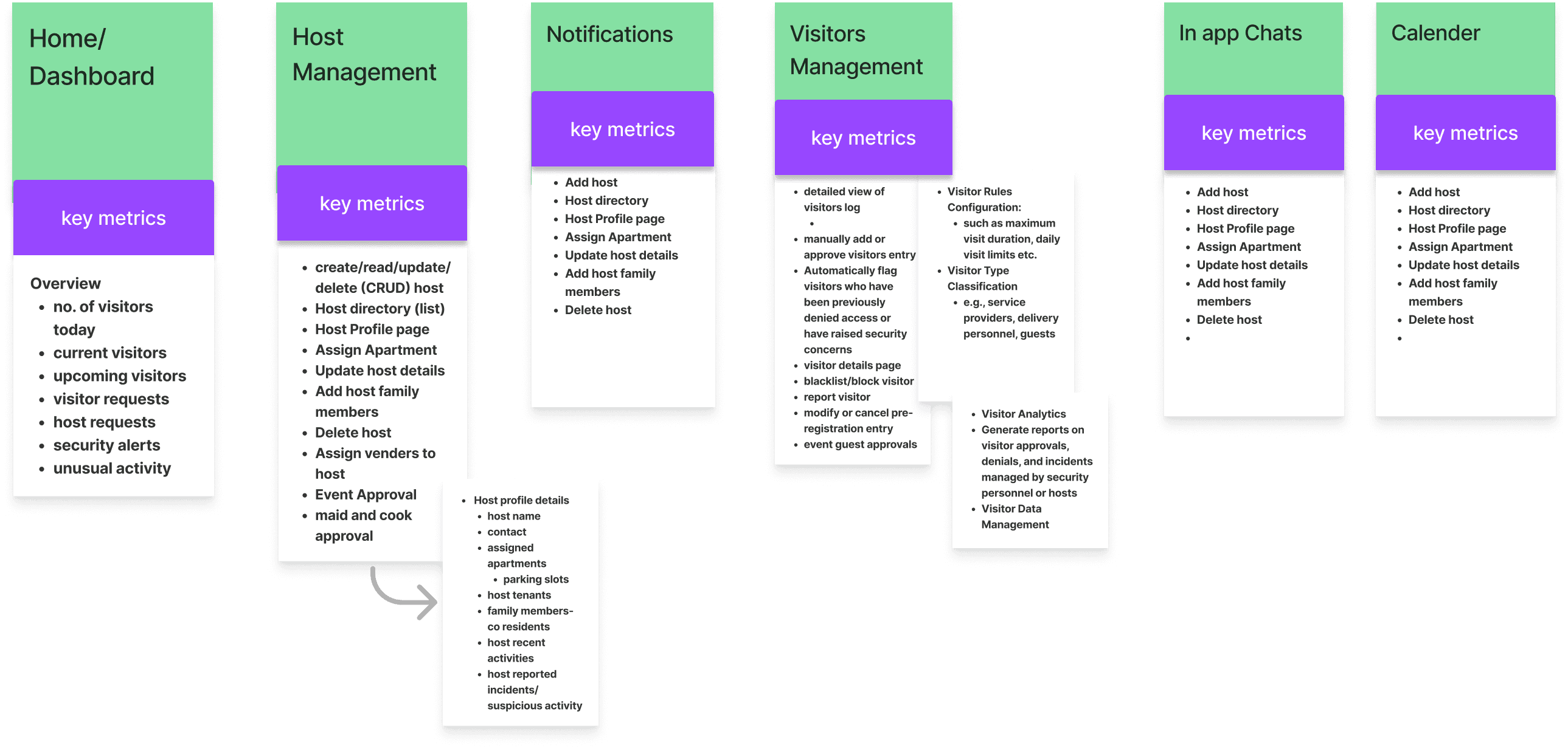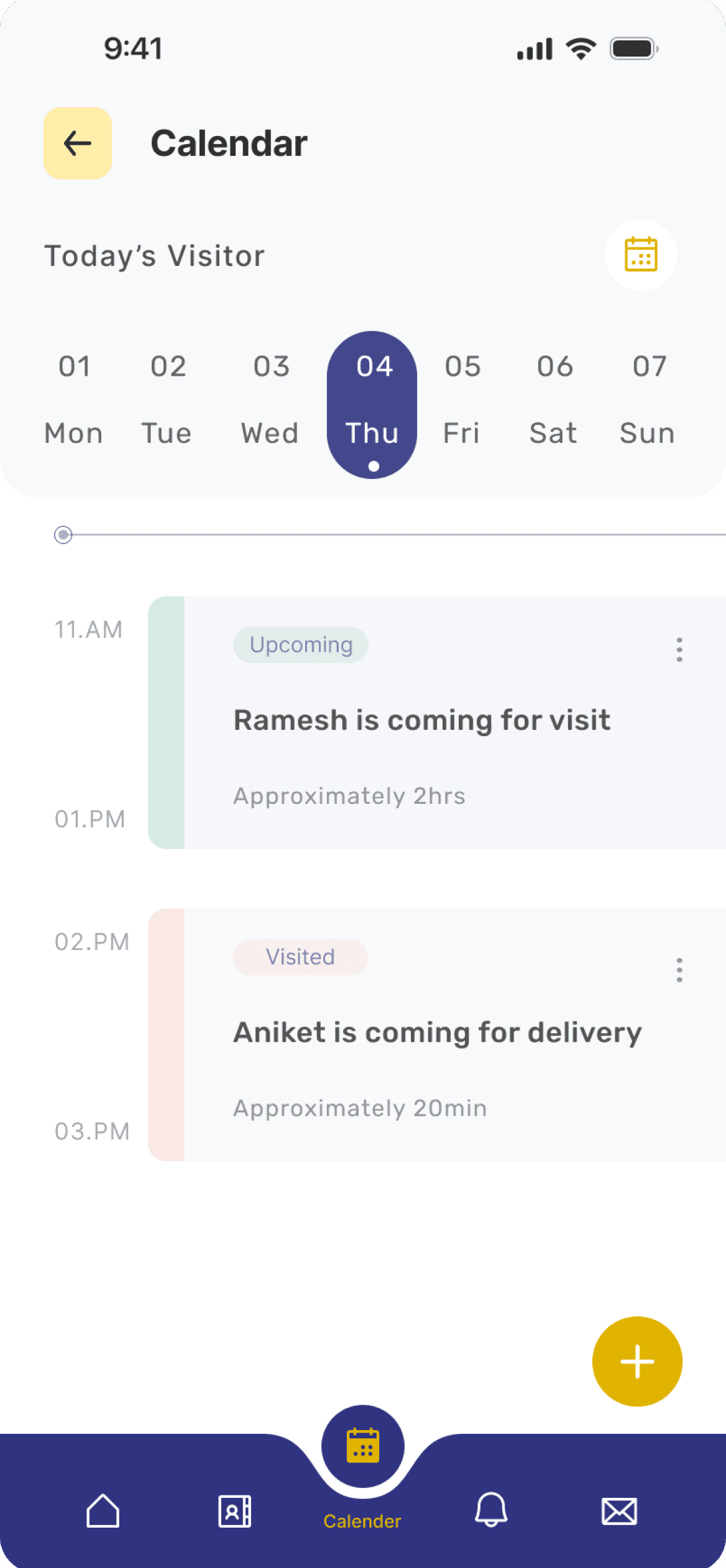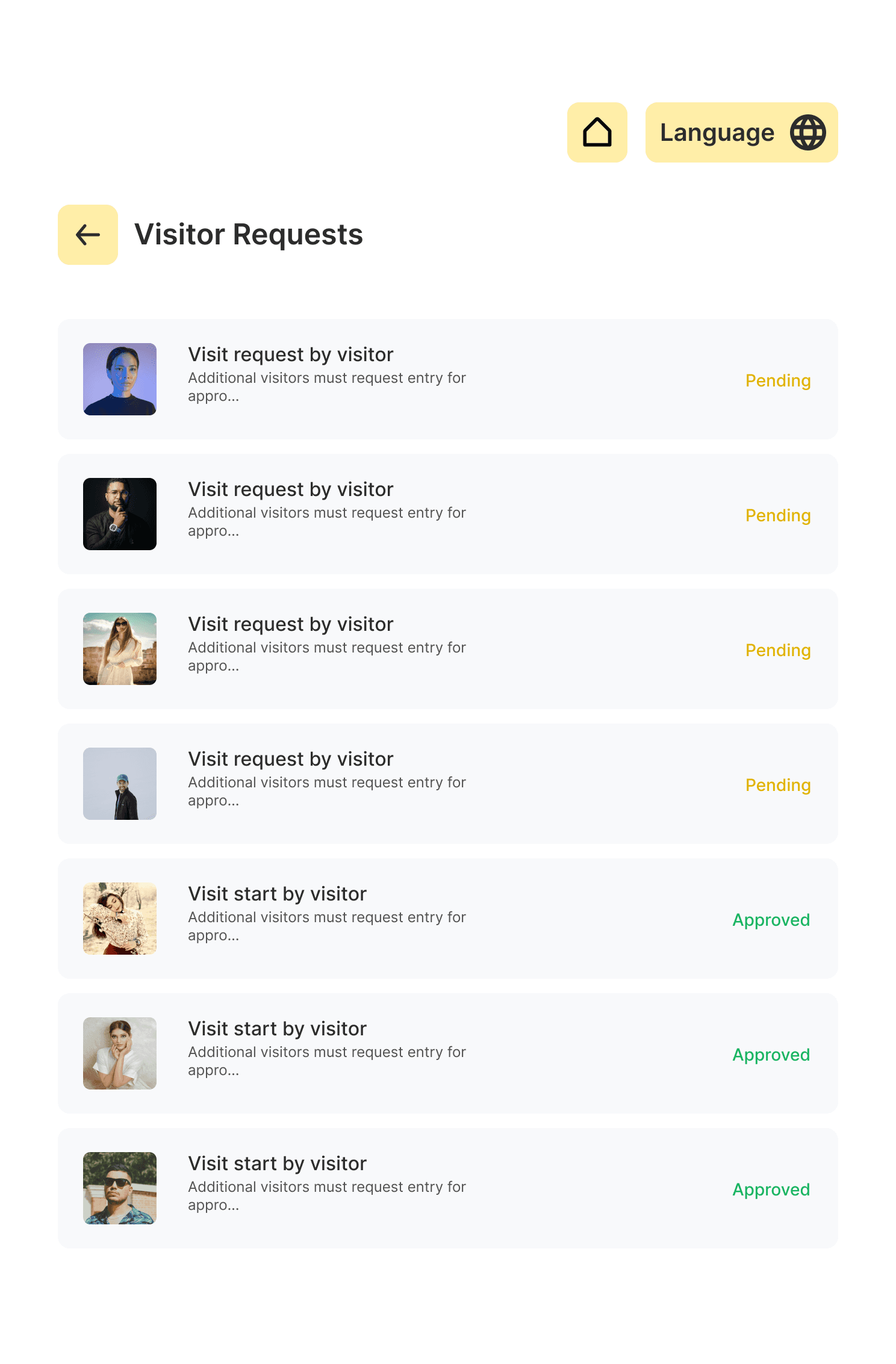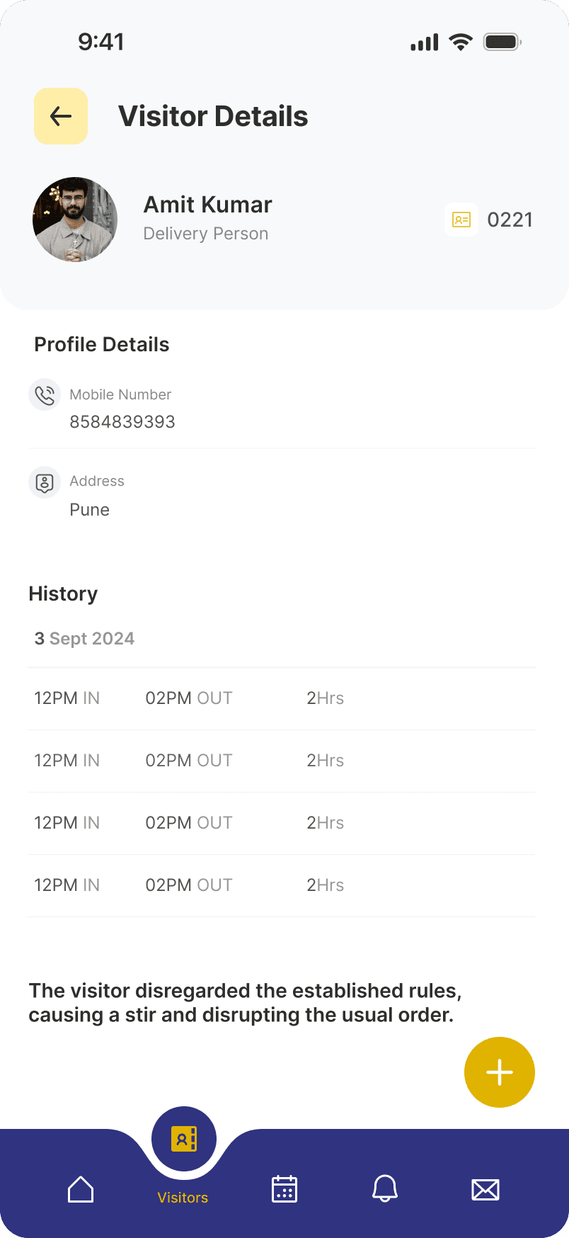 Notifications: A section displaying recent notifications like visitor arrivals, pending approvals, or important updates.
