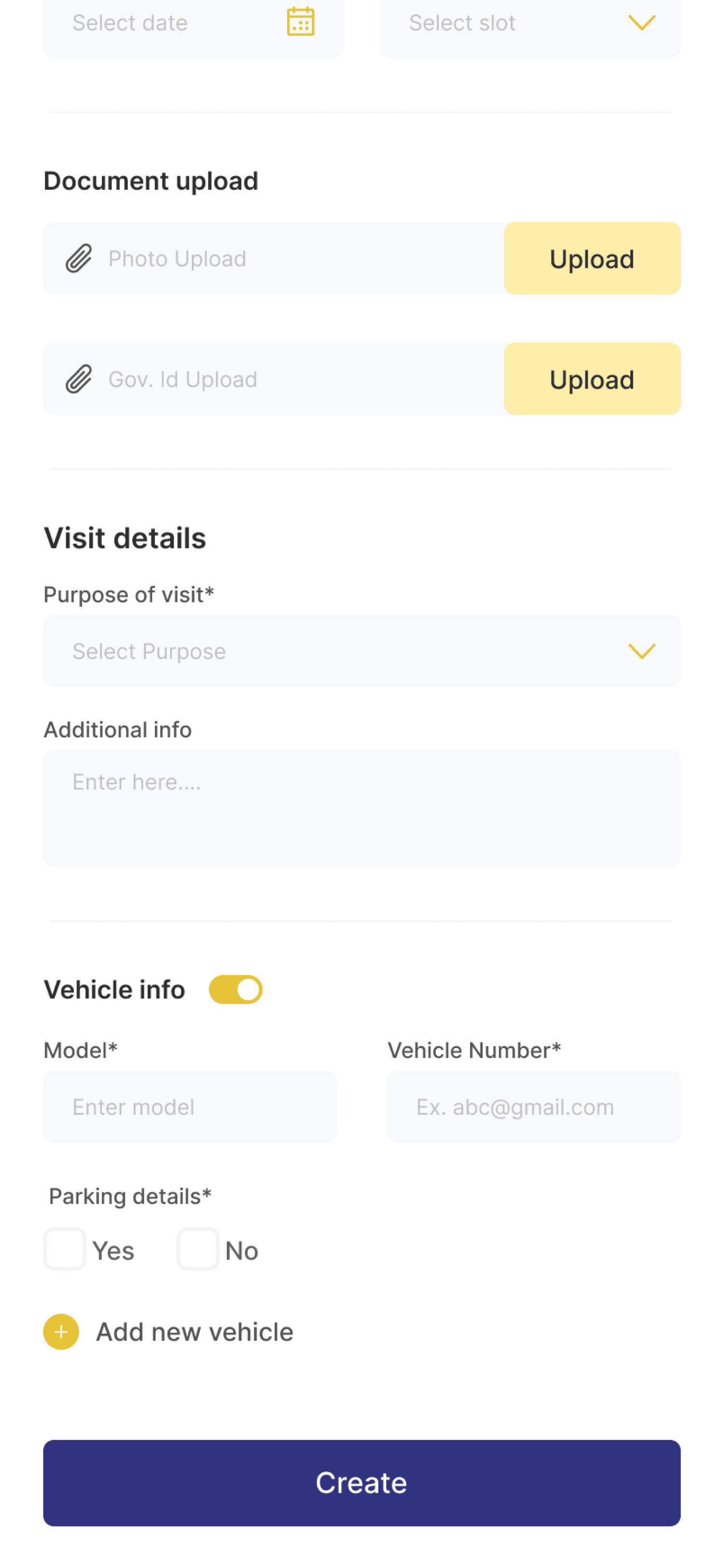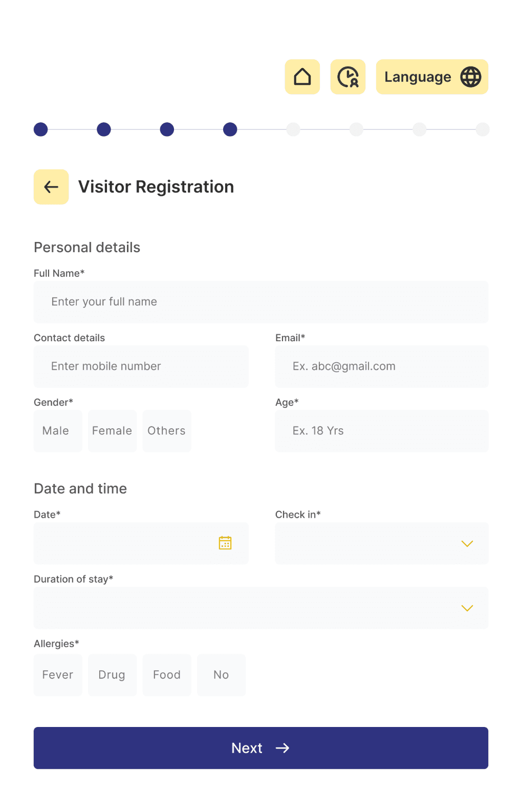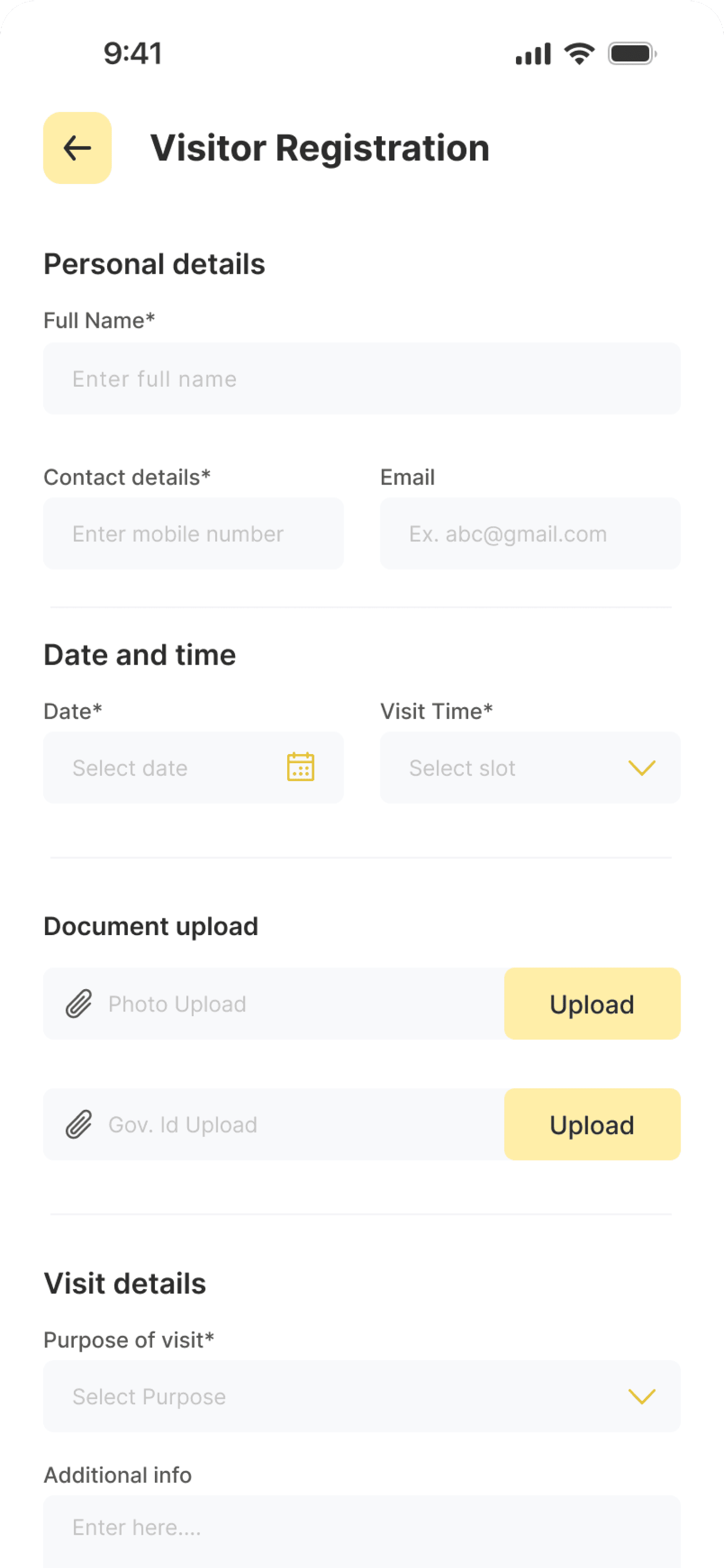 Visitor Form: Fields for name, contact, ID, and visit purpose.