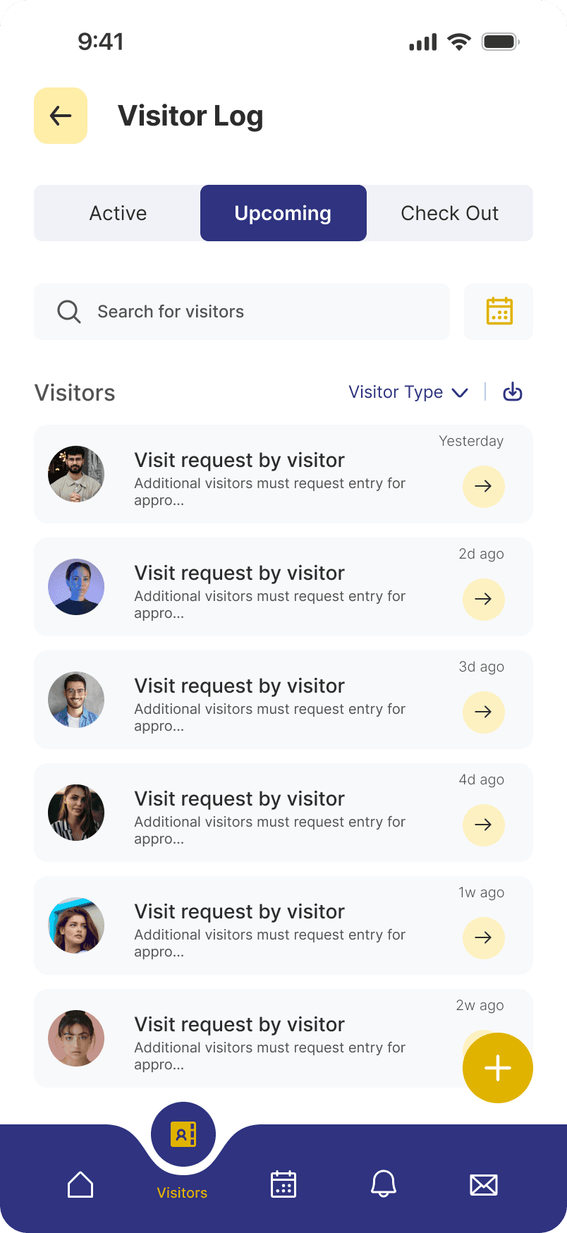 Upcoming Visitors: A preview of scheduled visitors, including names, arrival times, and meeting agendas.