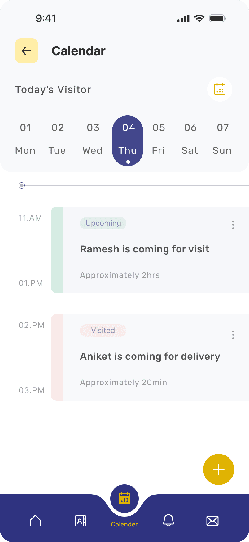 The Calendar Screen allows hosts to view today's scheduled visits with details such as visitor names, check-in times, and meeting duration. It provides an easy overview of the day’s appointments for efficient management.