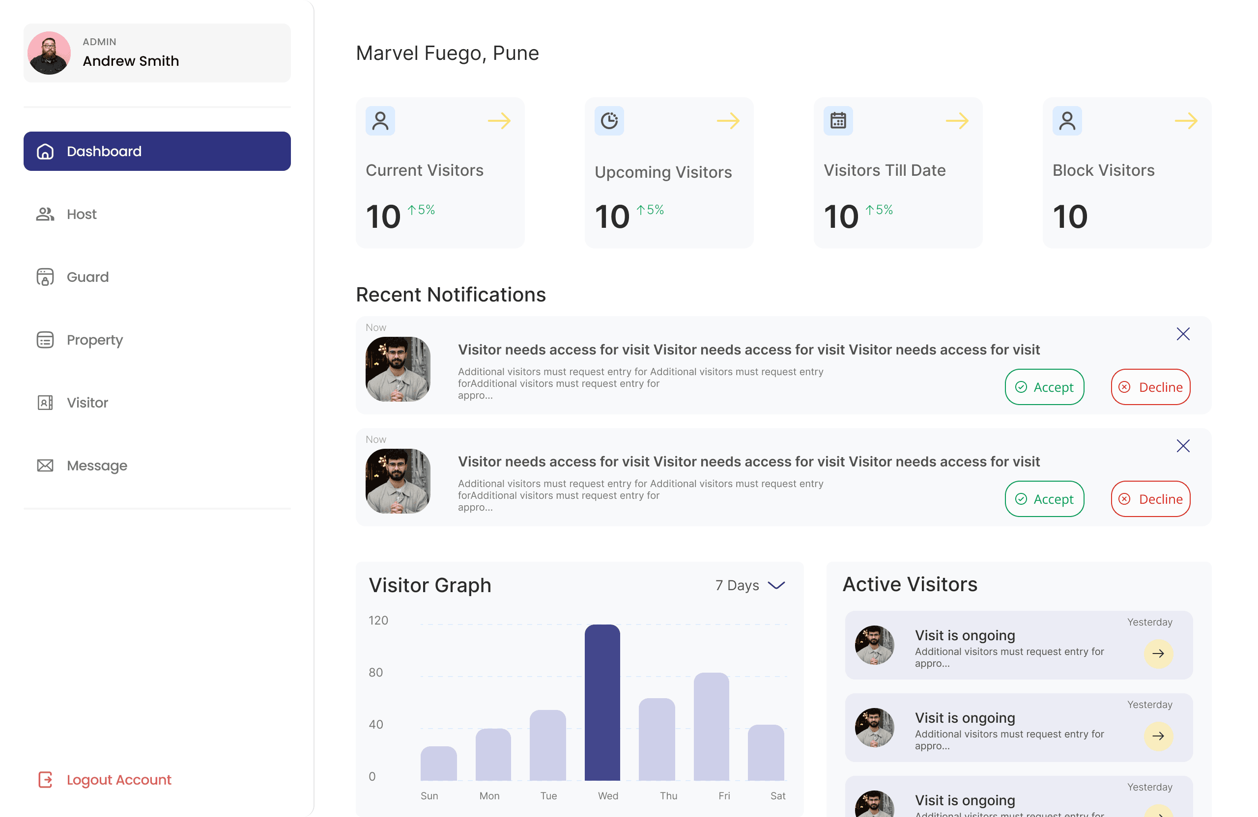 Intuitive Interface: Design a user-friendly interface for both visitors and admins that simplifies the check-in process, provides easy access to visitor details, and enhances overall system efficiency.